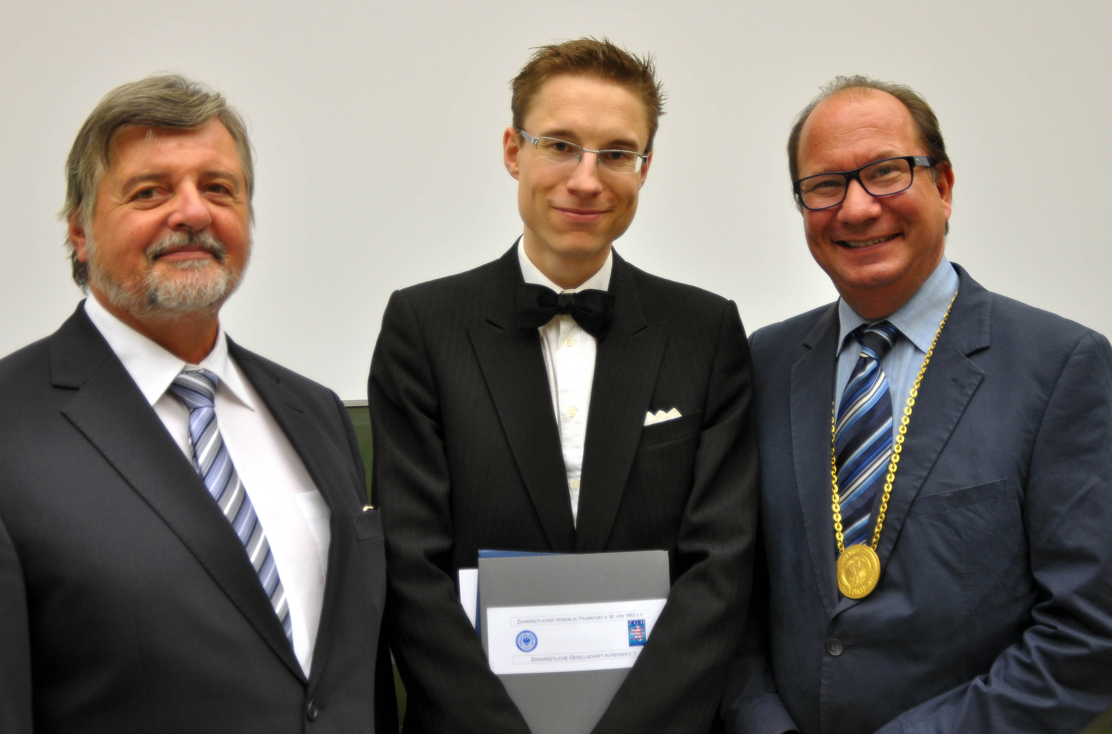Dr. Kurt Kolmer übergab den Preis, der nicht nur einen Scheck von 300,-€ beinhaltet, sondern auch Fortbildungsgutscheine der ZGH und die Festschrift des Zahnärztlichen Vereins zu Frankfurt sowie ein Buch über Zahnarzt-Apps.