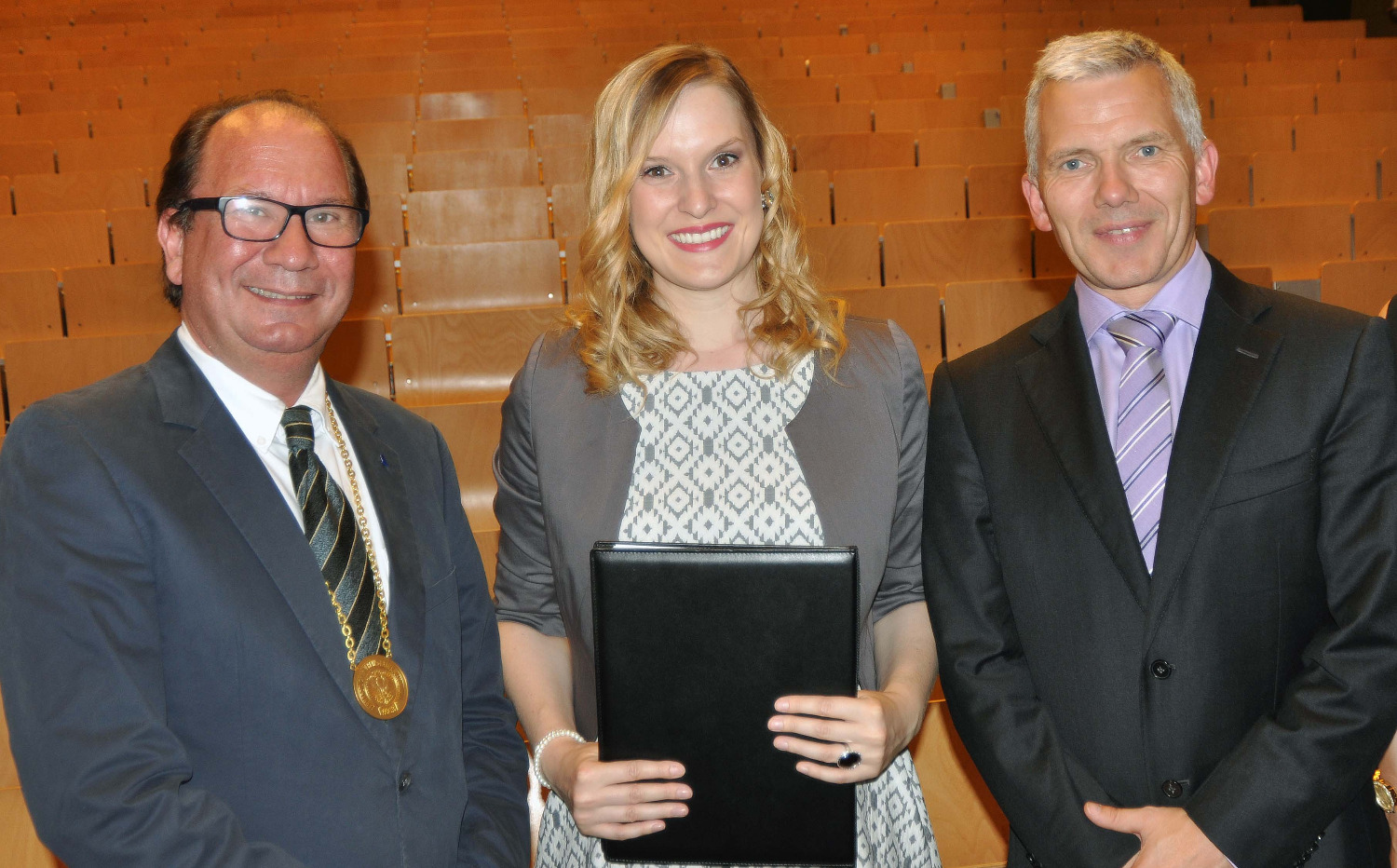 Da der eine, wegen einer Nachprüfung erst im Dezember sein Zeugnis erhalten wird, übergaben beide Präsidenten den Förderpreis des Sommersemesters 2016 an Frau Swantje Flamminger, die sich durch die Hilfe für ihre Kommilitonen ausgezeichnet hatte. Die frisch gebackene Kollegin erhielt den Scheck aus den Händen der beiden Präsidenten.