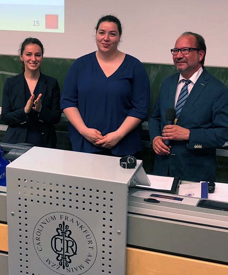 Im Anschluss wurden die Preise für besonderes kollegiales Engagement durch den Vorsitzenden den Präsidenten des Zahnärztlichen Vereins Herrn Prof. Dr. mult . Robert Sader und dem Präsidiumsmitglied Dr. Karina Obreja überreicht. Unter Standing Ovations durch das Examenssemester wurde der Preis Frau Dragana Gerovac, die sich als Vorsitzende der Fachgruppe Zahnmedizin nicht nur für ihr Semester sondern für alle Kommilitonen über mehrere Semester hinweg engagiert hatte, übergeben. Sichtlich gerührt nahm Frau Gerovac das Preisgeld , die kostenfreien Mitgliedschaften für 1 Jahr im Zahnärztlichen Verein zu Frankfurt am Main und der Zahnärztlichen Gesellschaft in Hessen, sowie Fortbildungsgutscheine entgegen.