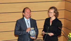 Frau Dr. Gretel Wittenburg aus der Klinik für MKG der Universitätsklinik Carl Gustav Carus an der TU Dresden konnte dieses Jahr die Auszeichnung gewinnen. Die unter der Leitung von Prof. Dr. Dr. Günter Lauer entstandene Arbeit trägt den Titel: Ossifizierung von Knochenersatzmaterial mit mesenchymalen Stammzellen in vitro“. Die Preisträgerin nahm nicht nur den Scheck mit dem Preisgeld von 1500,- € entgegen, sondern auch den obligatorischen Bembel mit dem Vereinswappen.