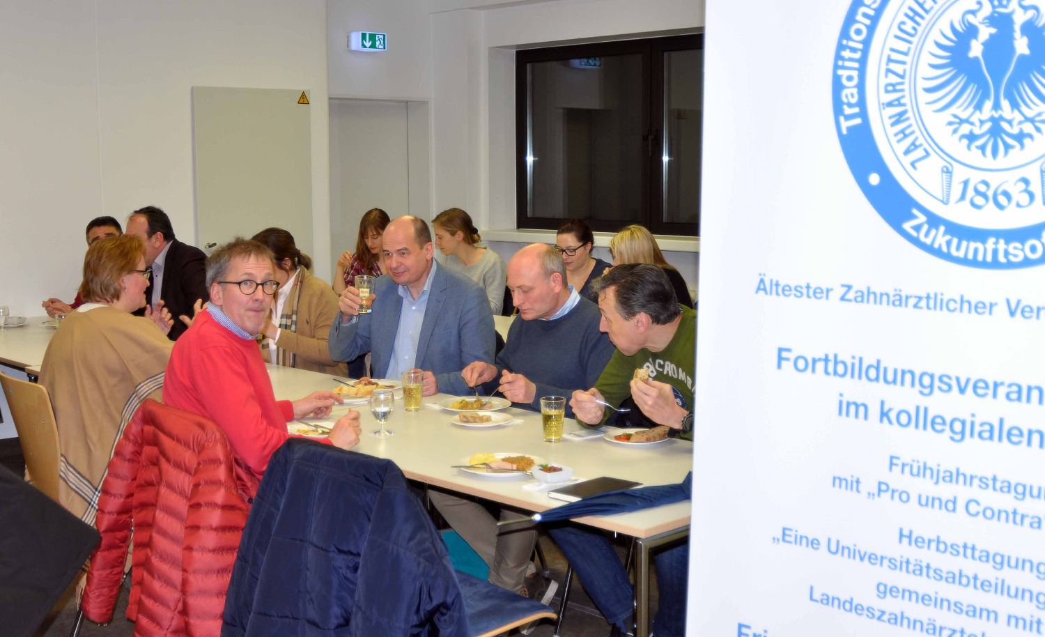 Hier und heute gab es nur noch Sturm in eine Richtung, nämlich auf das hessische Buffet, welches in traditioneller Art und Weise dazu führte, dass sich Studenten mit Kollegen und gender korrekt Zahnärztinnen mit Zahnärzten austauschen konnten.