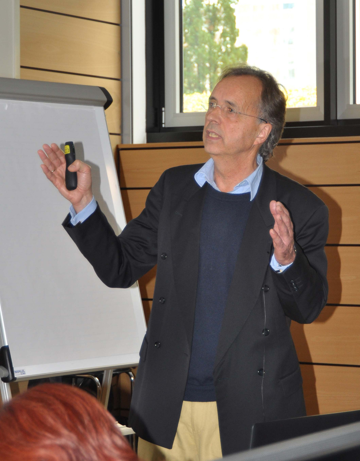 Danach übernahm Prof. Dr. Reiner Mengel den Stab mit seinem spannenden Vortrag über "die Schattenseiten der Implantat Prothetik". Aussagen über die Ätiologie des Implantatverlusts können nur über Langzeitstudien gemacht werden. Prof. Mengel stellte das Marburger Computerprogramm zur Datenverwaltung und Analyse vor. Mit diesem Programm wurde auch die 26-Jahres-Studie von Implantaten bei Patienten mit Parodontitis ausgewertet. Es zeigten sich neben der Überlebensrate von 83%, also ähnlich der bei parodontal Gesunden, die Vorteile einer herausnehmbaren Versorgung. Neben verschiedenen Studien zu Implantaten bei Patienten mit aggressiver Parodontitis ging der Referent auch auf den bukkalen Knochenabbau bei diesen Patienten ein. Er führt dies auf die Biomechanik in der Oberkieferfront zurück, die zu einer Auslenkung der Implantate unter Belastung nach labial führt. Die langjährige Erfahrung der Marburger Prothetik identifizierte die Faktoren des Erfolgs von Implantatversorgungen: Gute Mundhygiene, regelmäßiges Recall und reinigungsfreundliche Suprakonstruktionen.