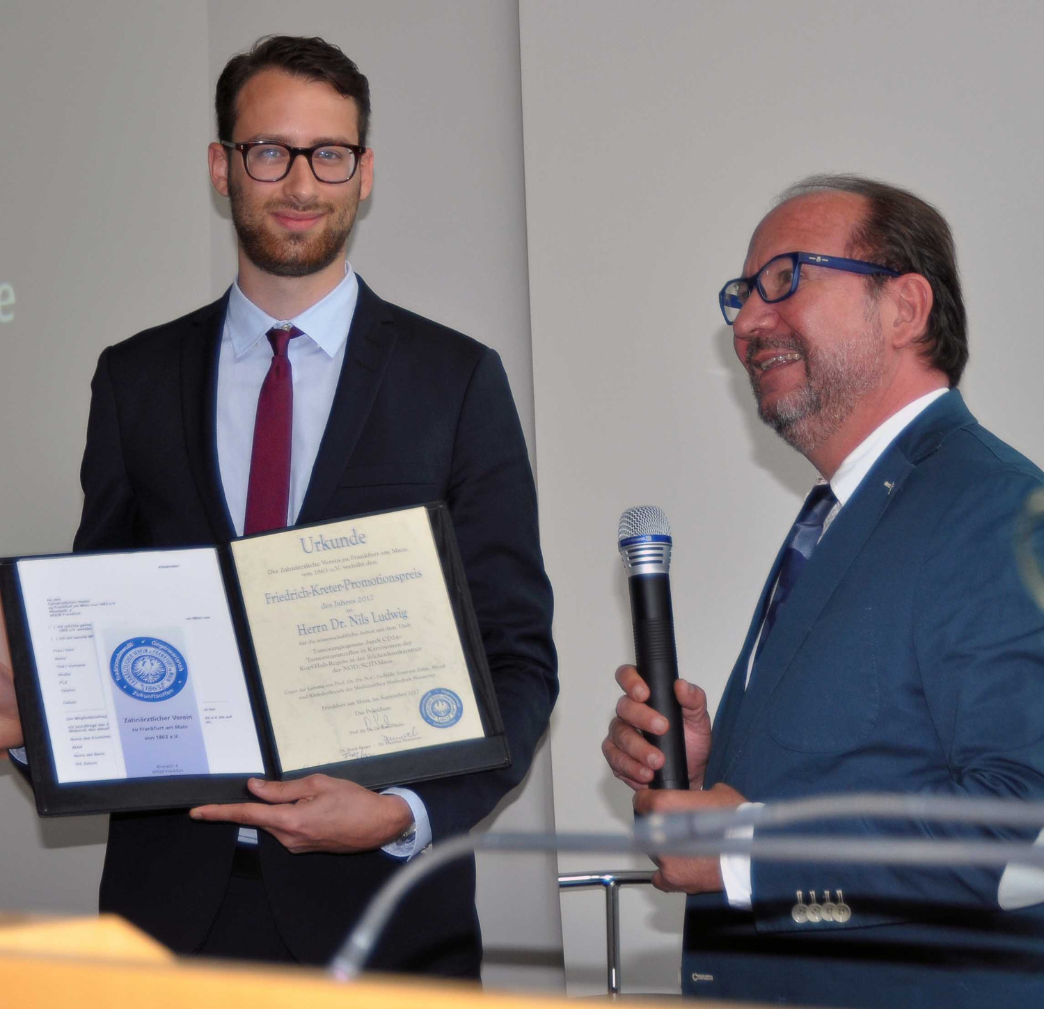 In diesem Jahr wurde der Fiedrich-Kreter-Preis, der der älteste Promotionspreis Deutschlands ist, an Herrn Dr. Nils Ludwig zu dem Thema: "Tumorangiogenese durch CD24+ Tumorstammzellen in Karzinomen der Kopf-Hals-Region in der Rückenhautkammer der NOD/SCID-Maus" verliehen.Der Preisträger und Leistungssportler stellte seine Arbeit, die durch ein Komitee aus 13 Arbeiten zum Sieger gekürt wurde in einem Kurzvortrag vor und betonte die Wichtigkeit der Grundlagenforschung. Ihm wurde das Preisgeld, ein Buch über die Geschichte des Zahnärztlichen Vereins zu Frankfurt und den traditionellen Bembel überreicht.